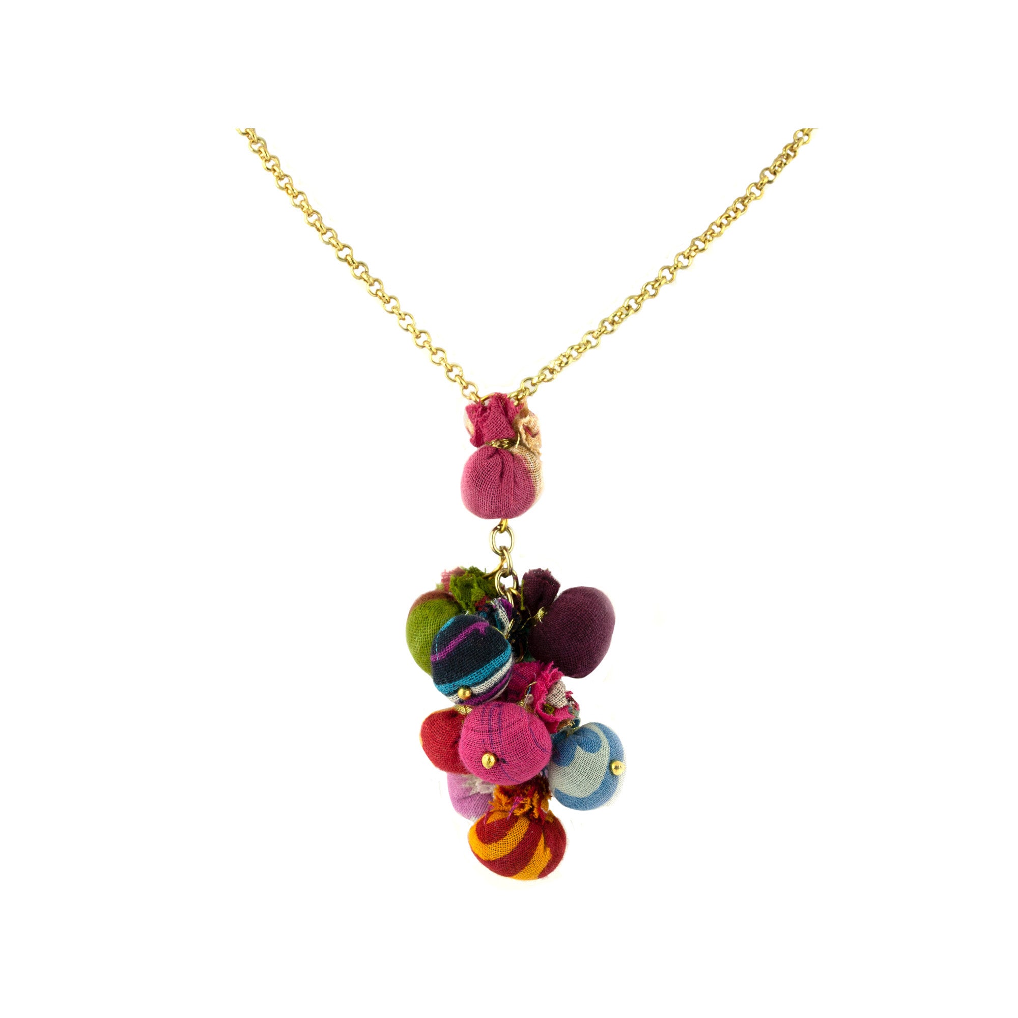 Halsband tillverkat av återvunnet material. Designat som ett kluster av små runda tygpåsar med detaljer kedja av mässingsfärgad metall.