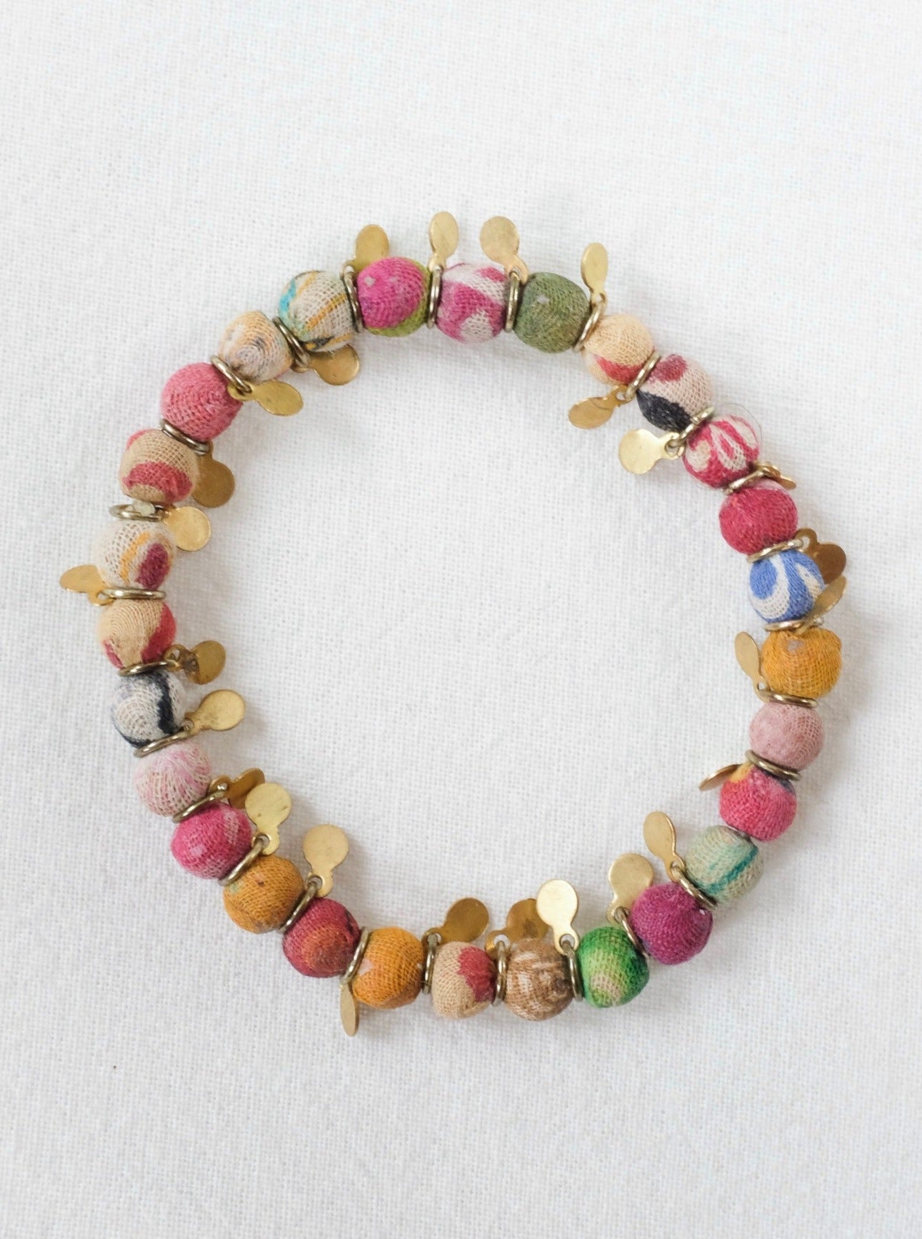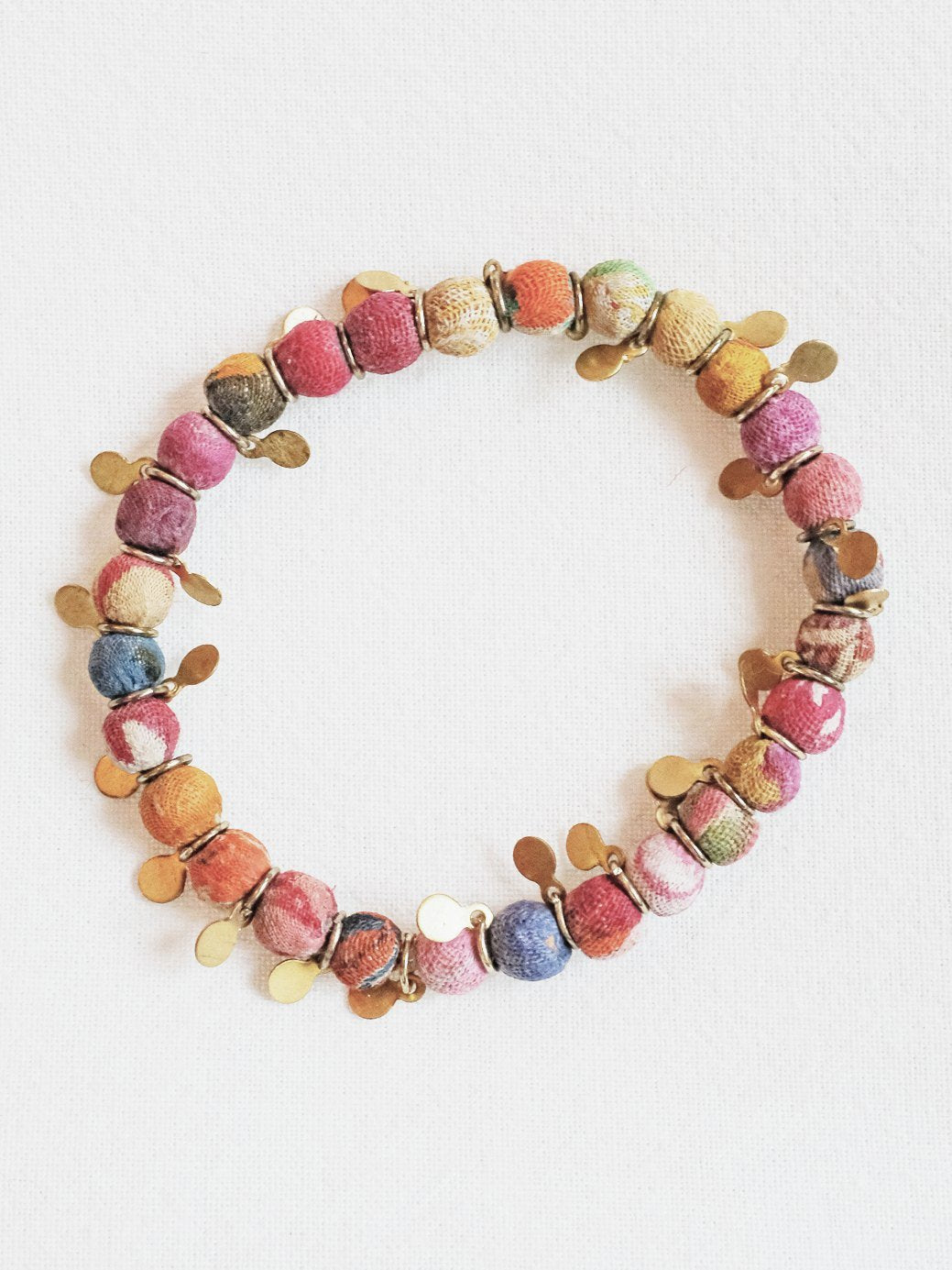 Armband tillverkat av tygkulor av återvunnet tyg. Armbandet är trätt på gummiband för att passa alla, och dekorerat med metalldekorationer.