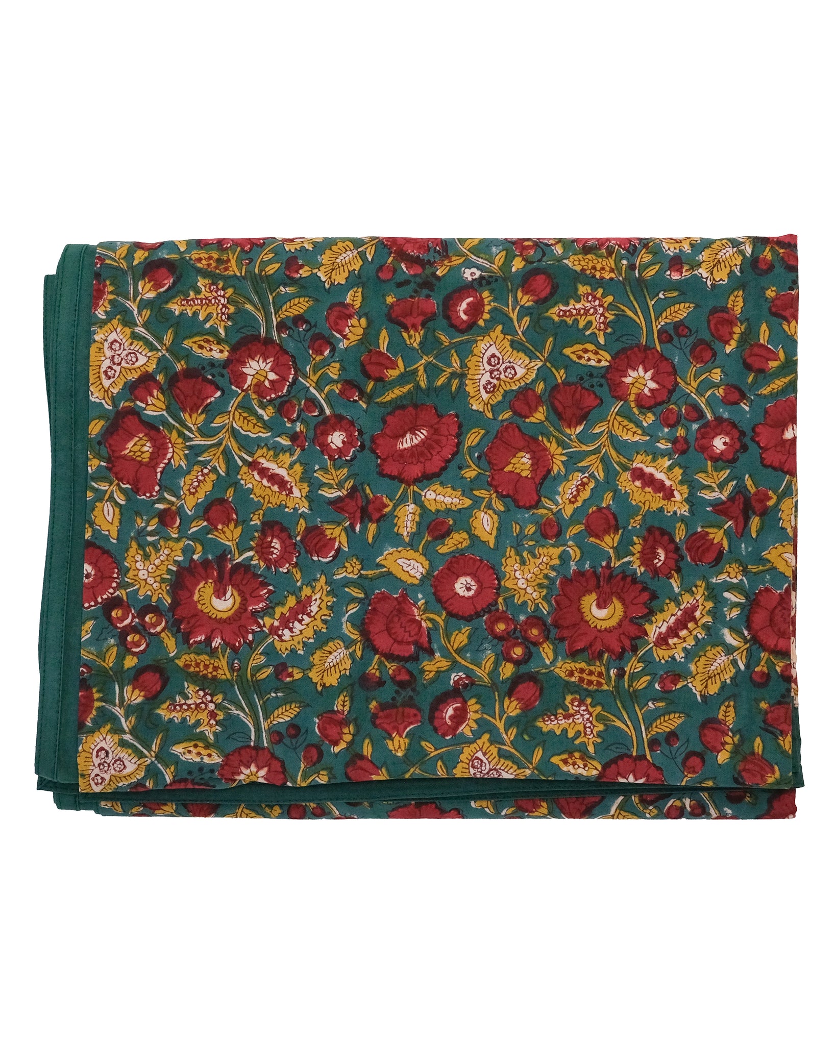 Duk med handtryckt mönster i grönt och rosa. Tillverkad i Jaipur, Indien.