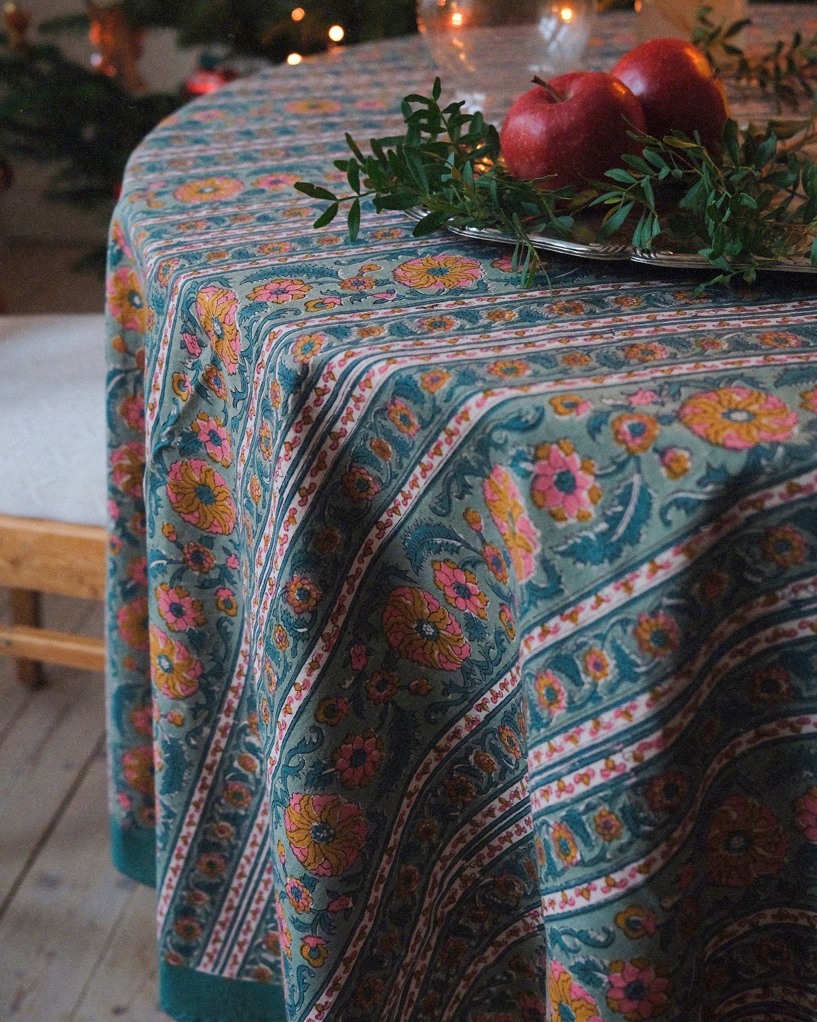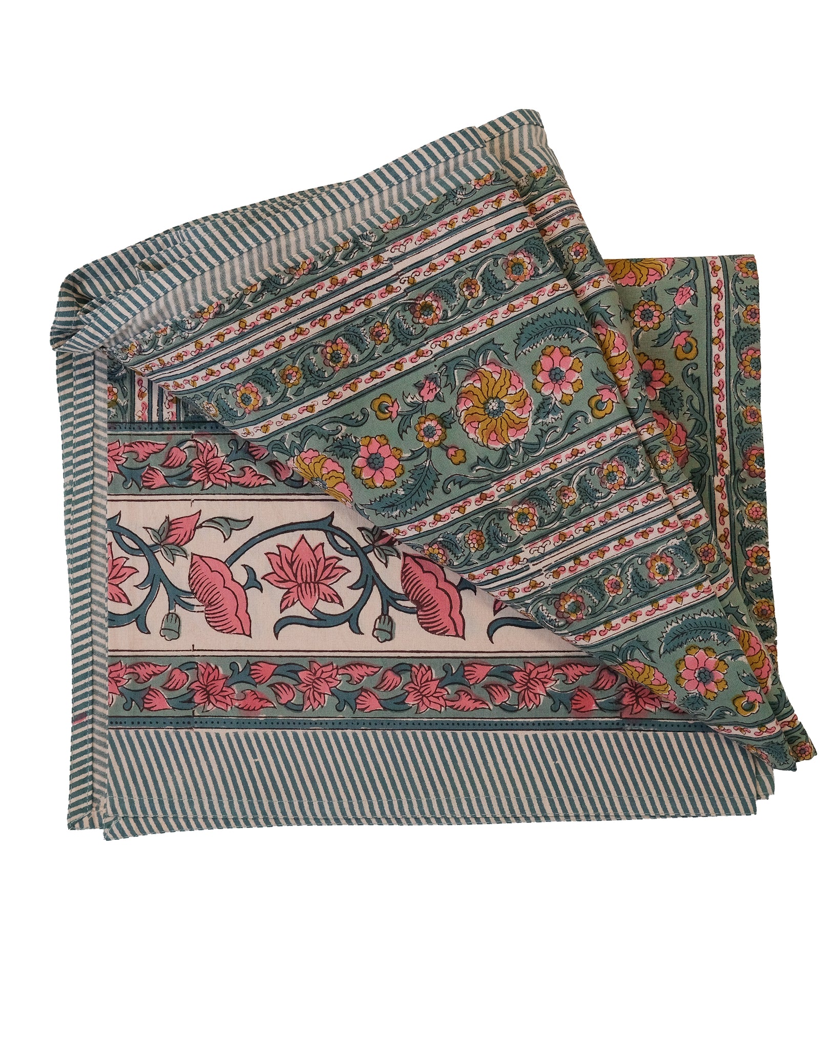 Duk med handtryckt mönster i grönt och rosa. Tillverkad i Jaipur, Indien.