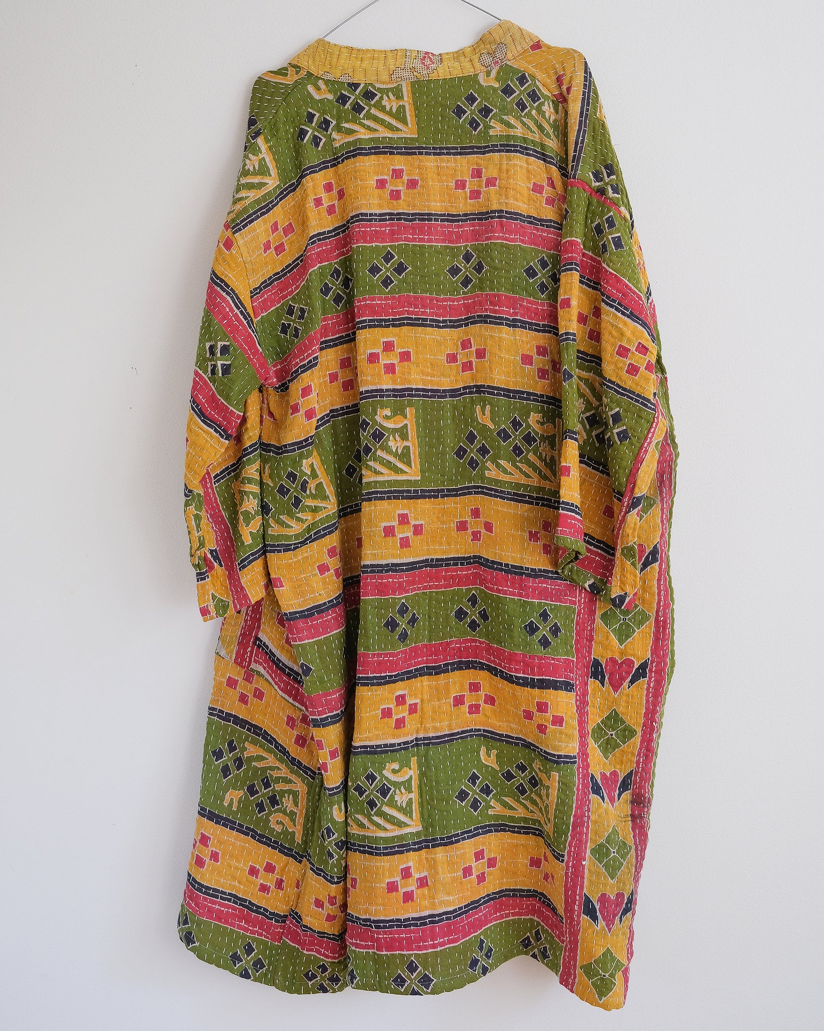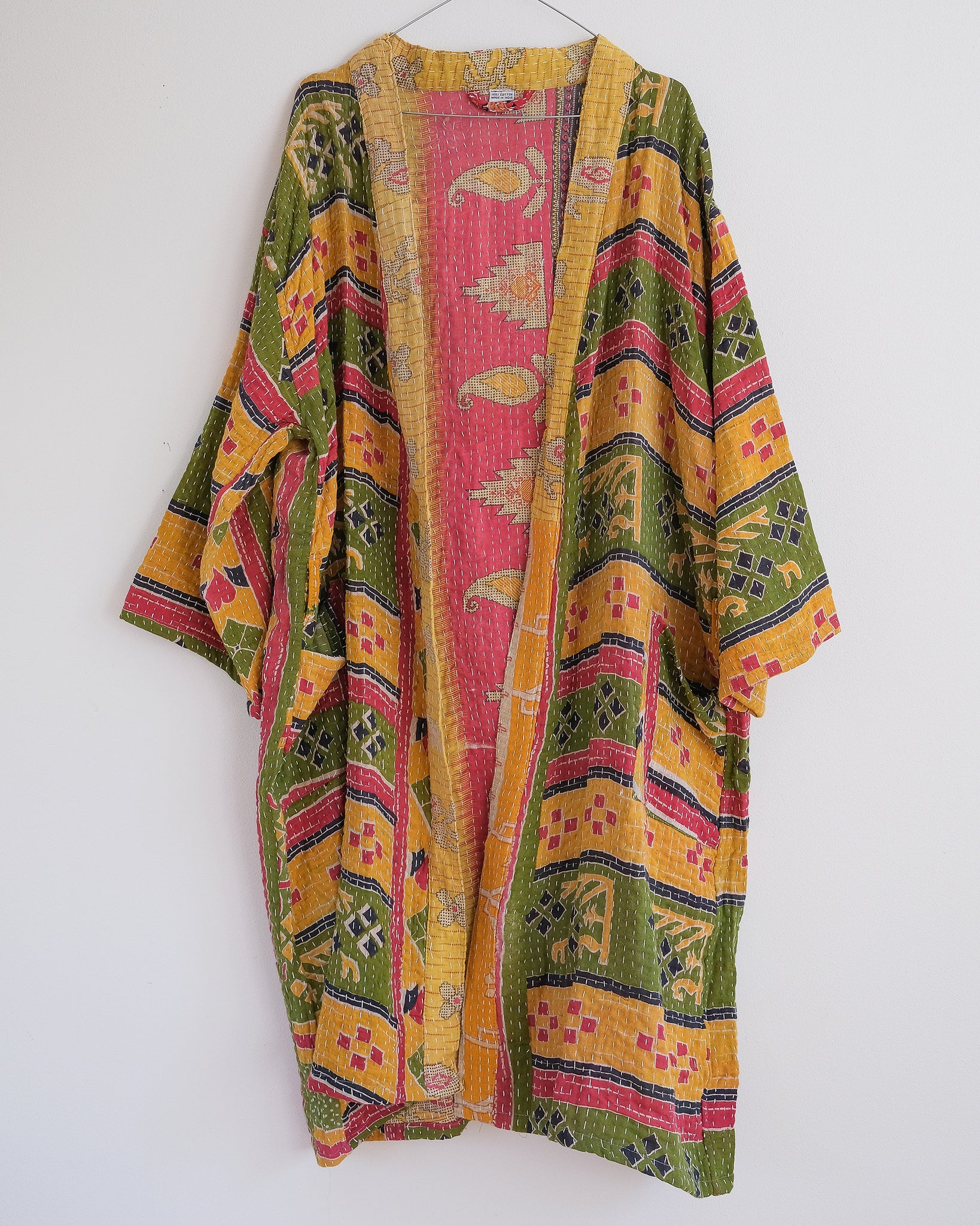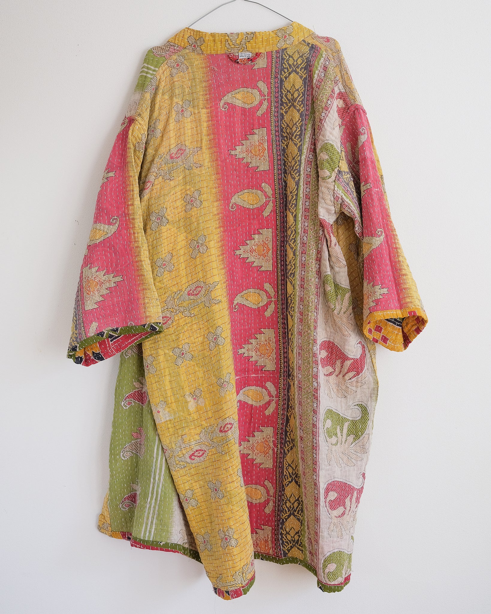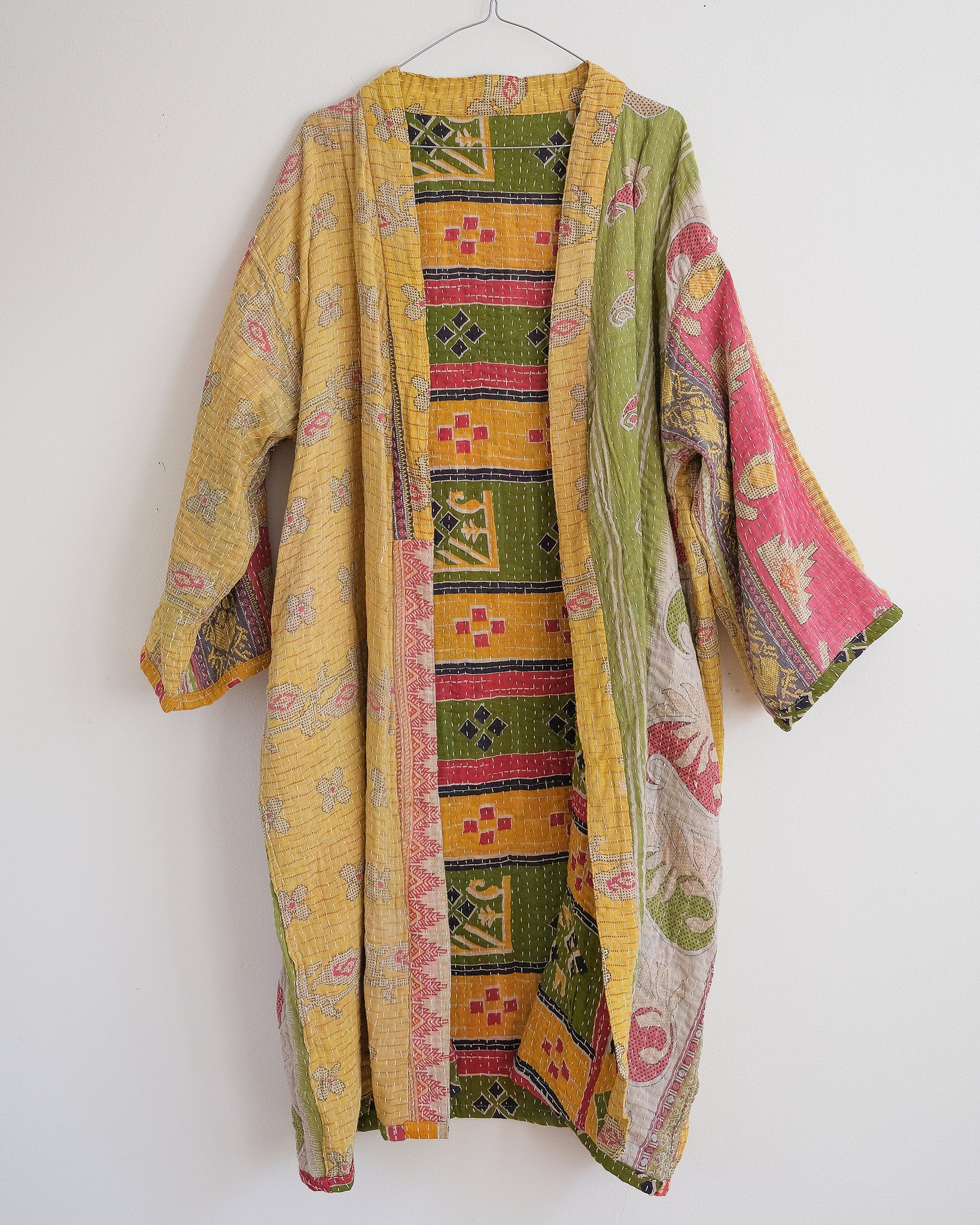 Lång vändbar jacka i mjukt återvunnet kanthatyg i bomull. På ena sidan har jackan stora fickor och på den andra en hank i nacken. En jacka som passar lika bra som en lite tjockare morgonrock som en färgstark jacka under den varmare delen av året.