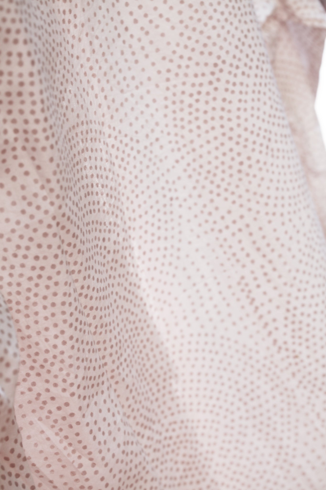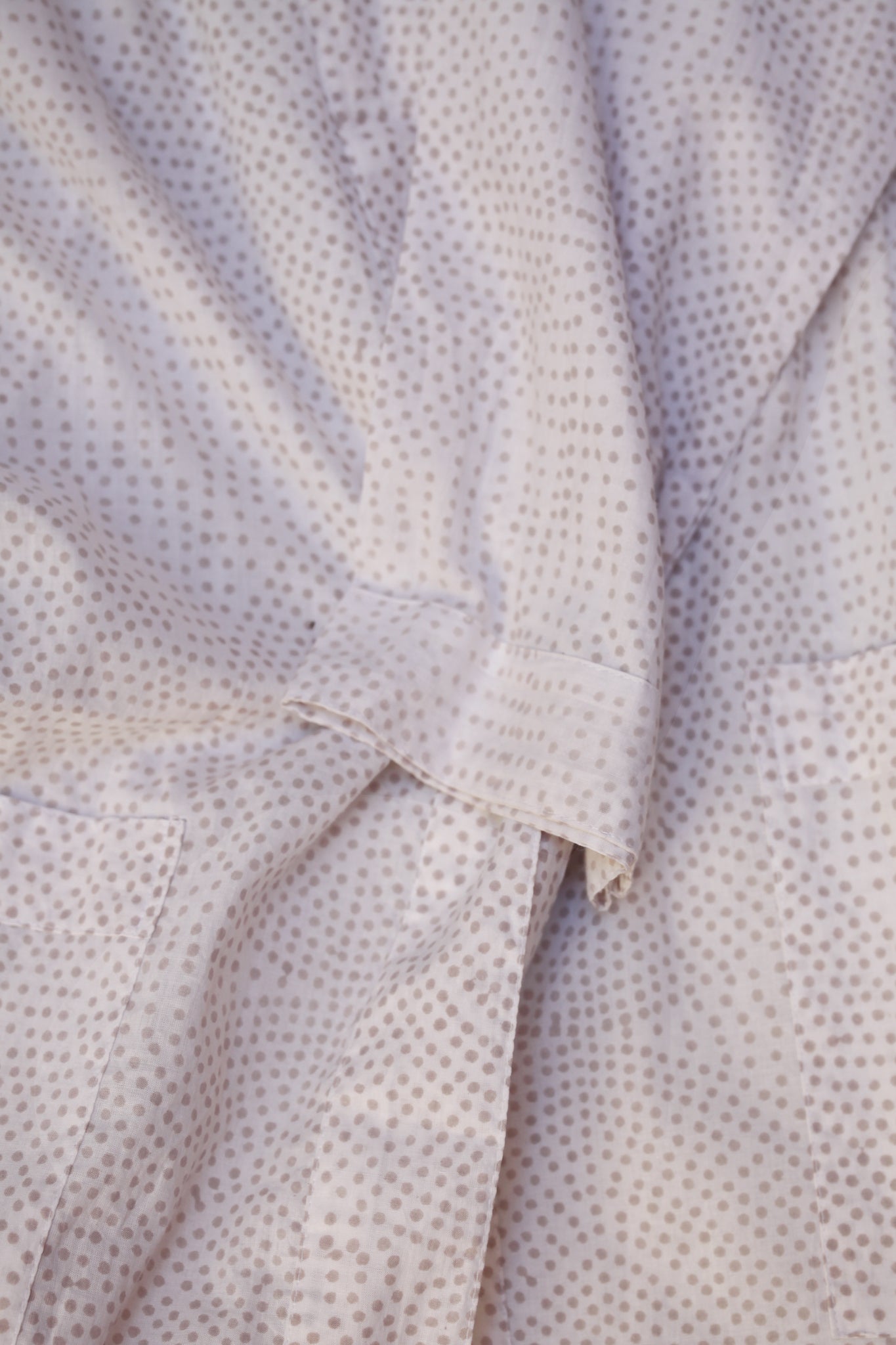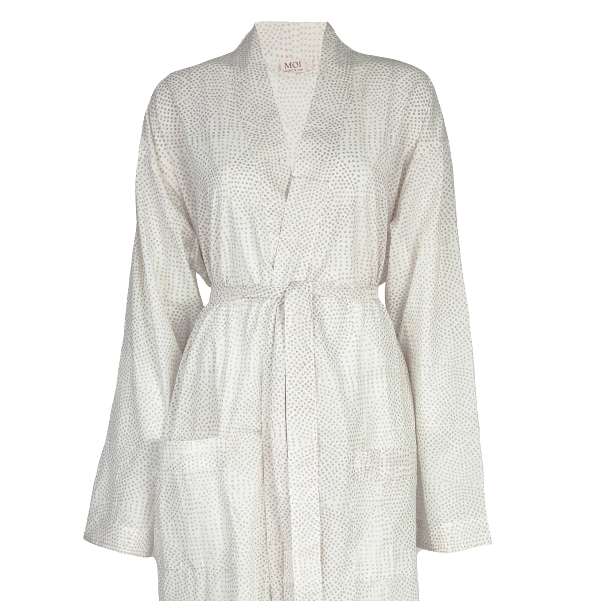 Morgonrock i handtryckt, mjukt bomullstyg med ett mönster i beige och vitt.