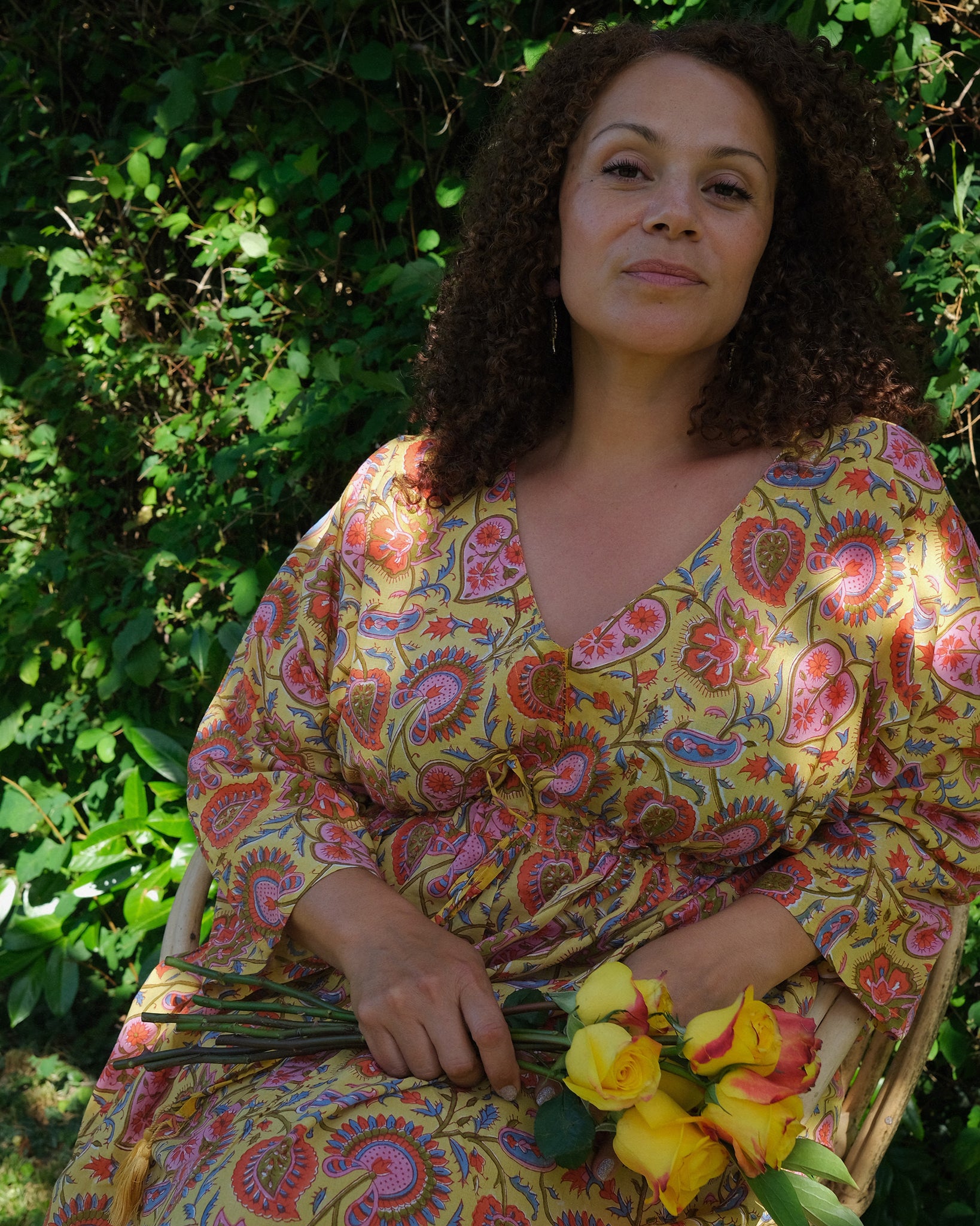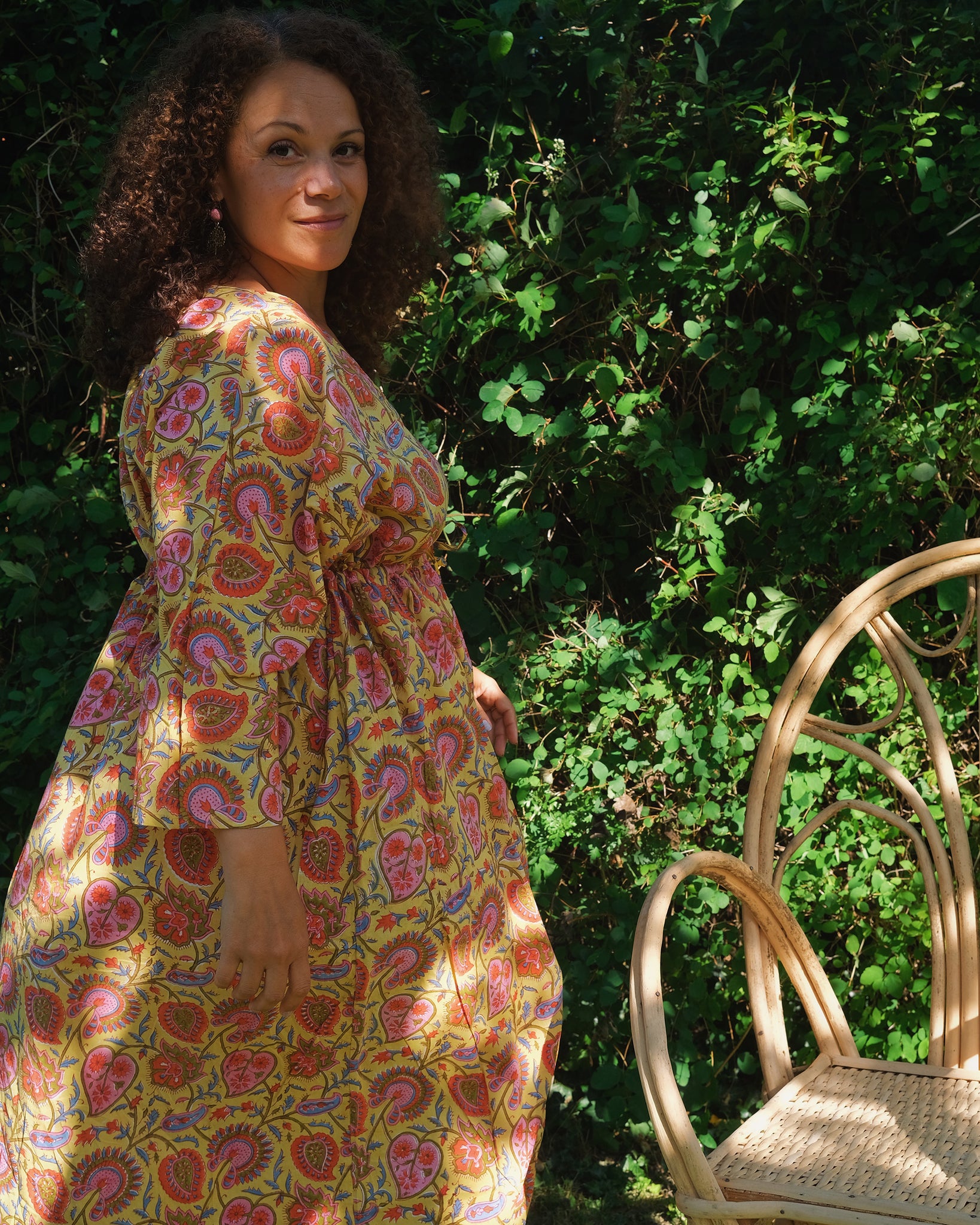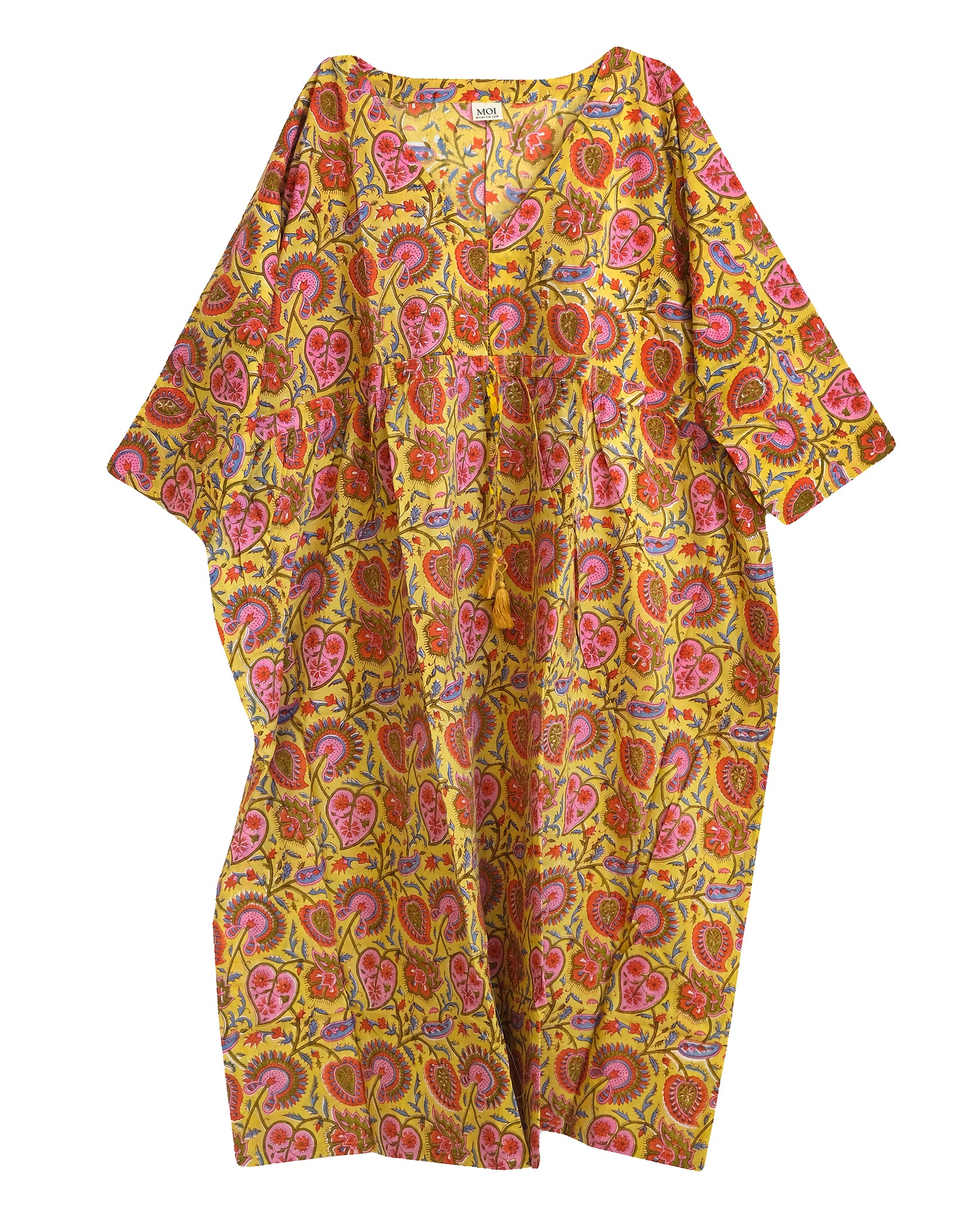 Kaftanklänning i mjukt, handtryckt bomull med kort ärm. Knytning/dragsko i midjan.