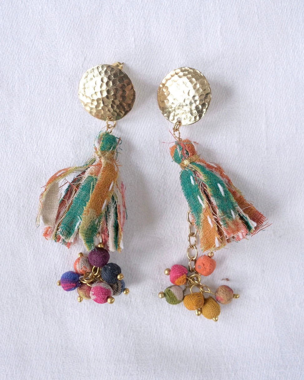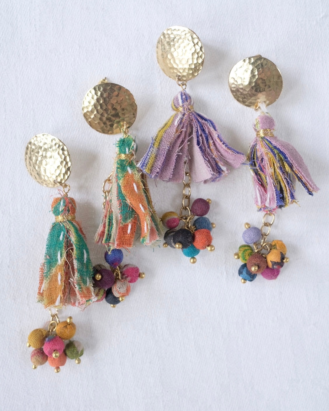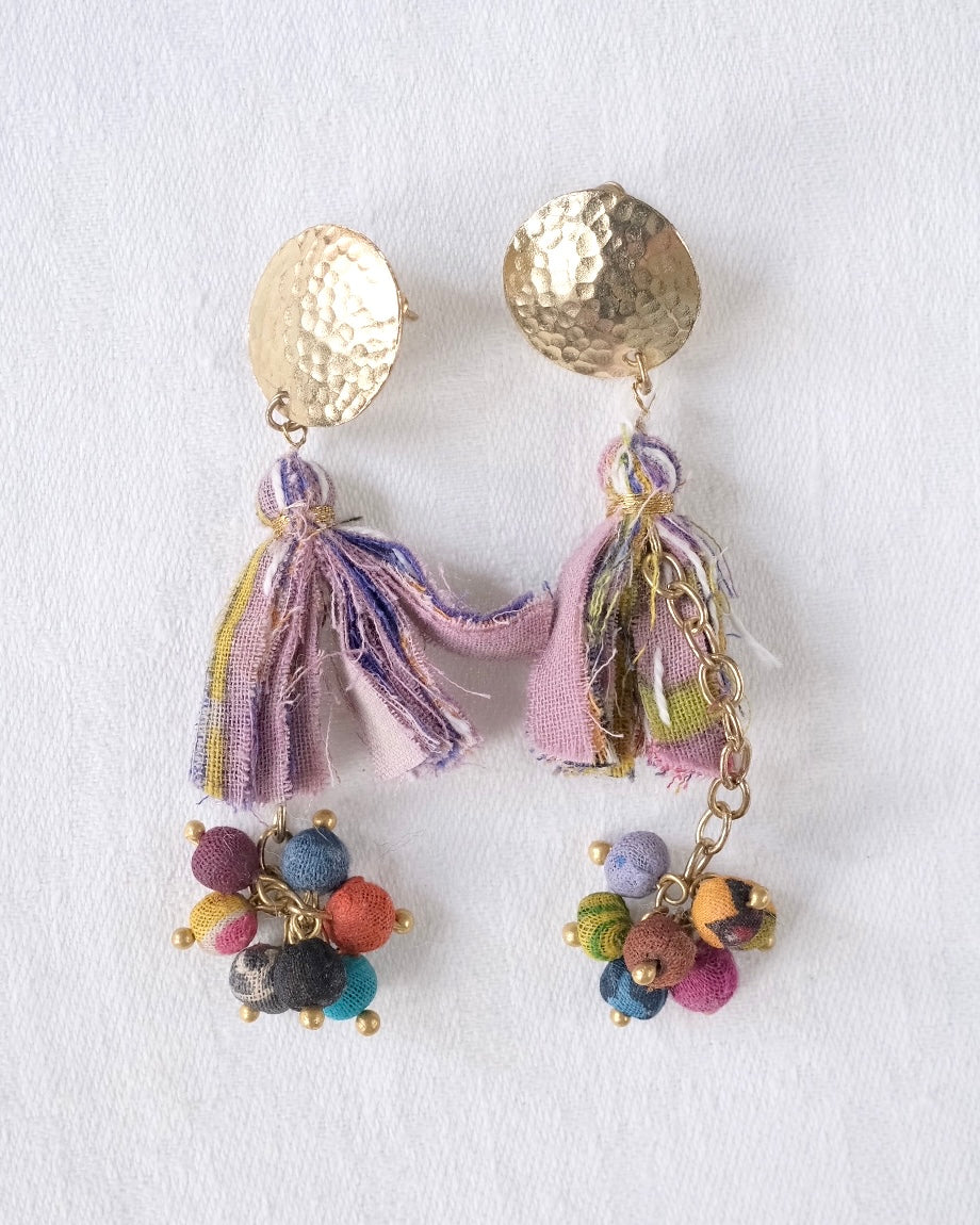 Örhängen tillverkade av återvunnet tyg  i olika färger och mässingsdetaljer.