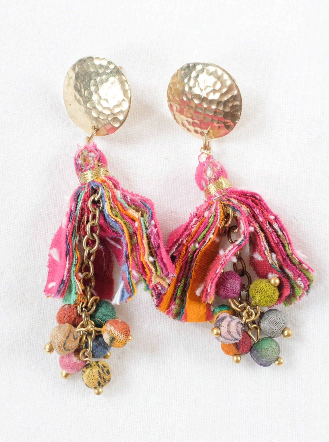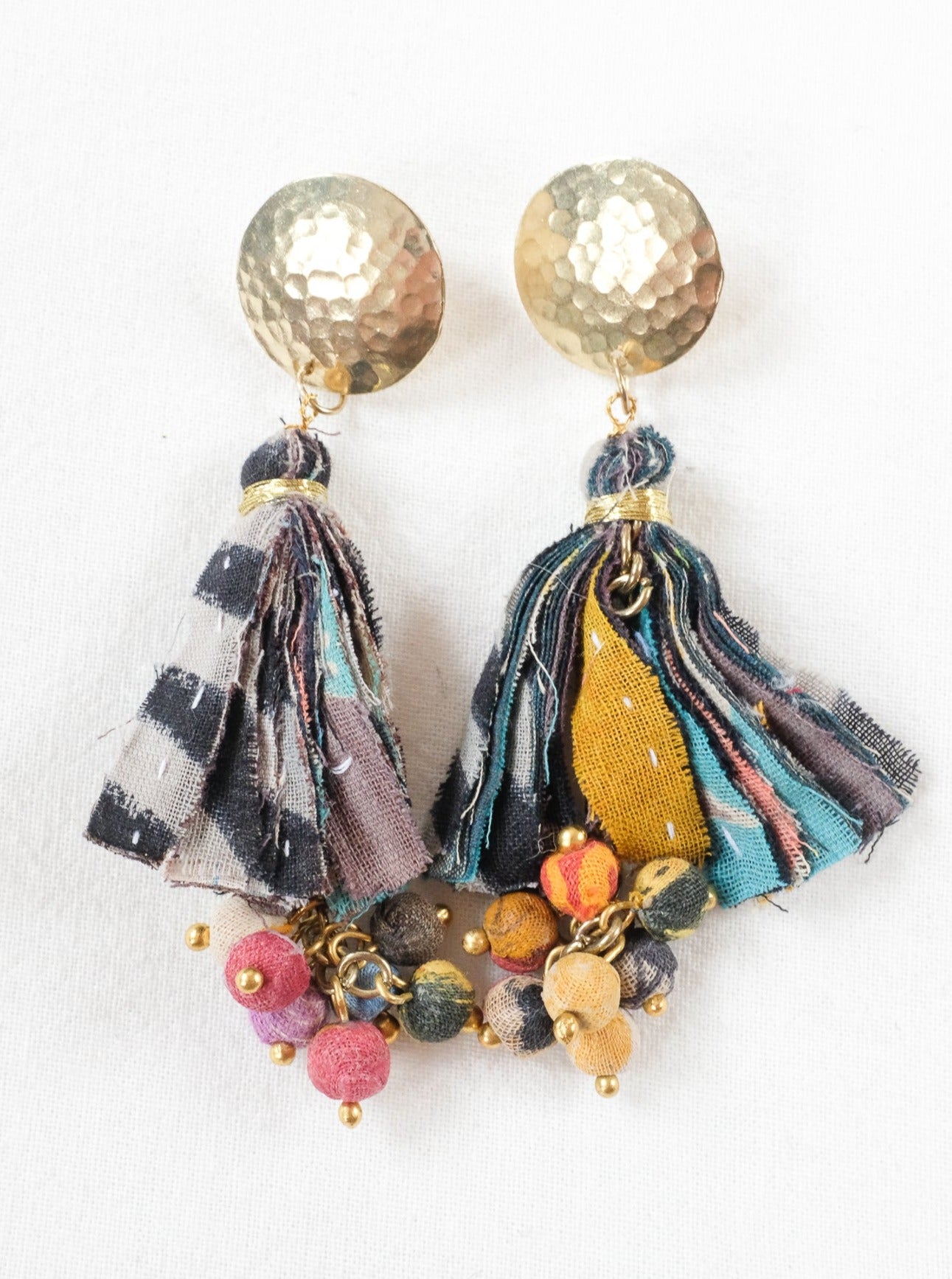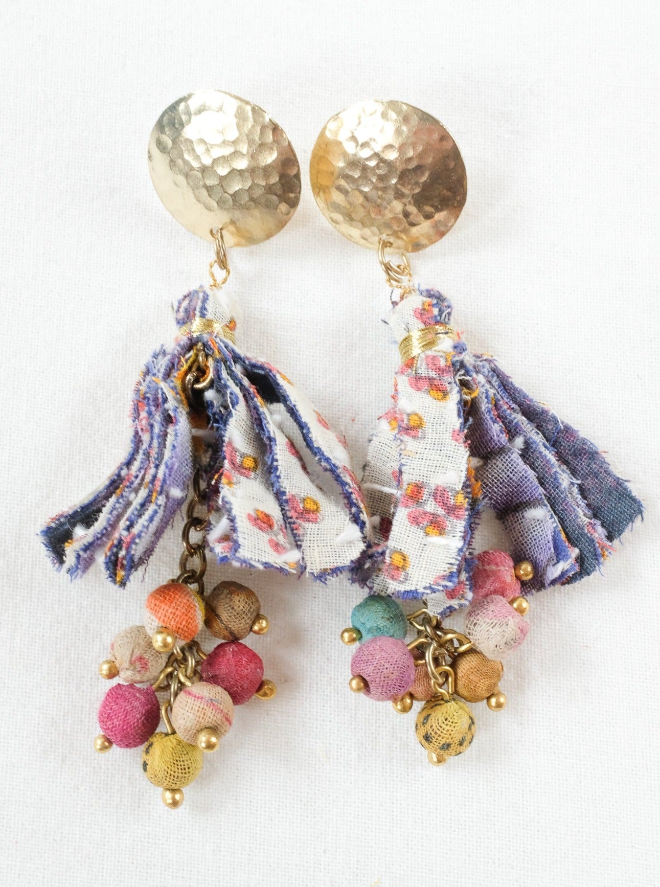 Örhängen tillverkade av återvunnet tyg  i olika färger och mässingsdetaljer.