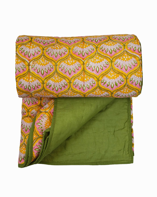 Våra överkast är tillverkade av mjukt handtryckt, quiltat bomullstyg. De finns i flera mönster som varierar för varje säsong.
