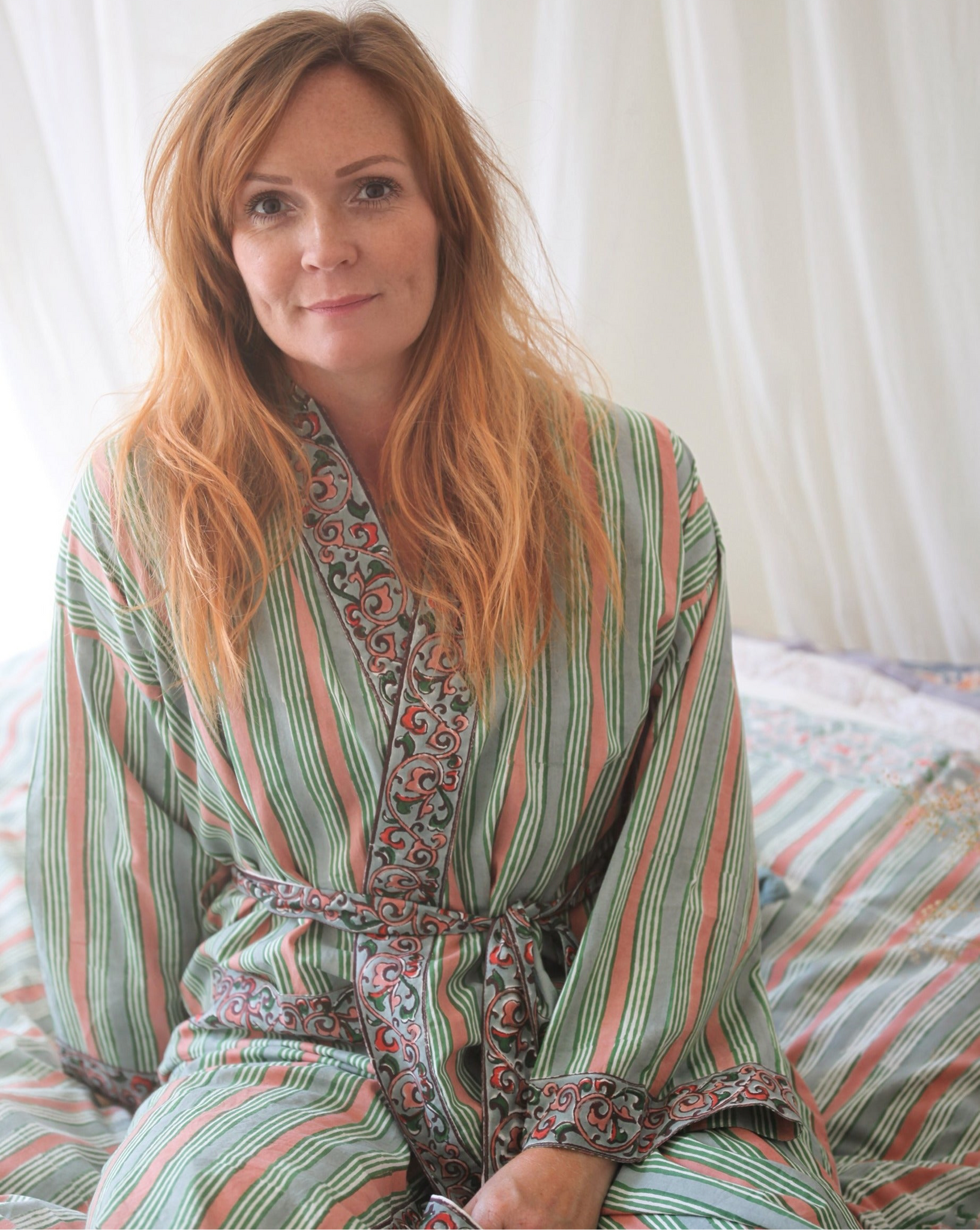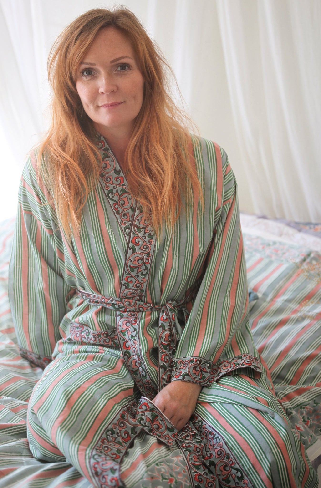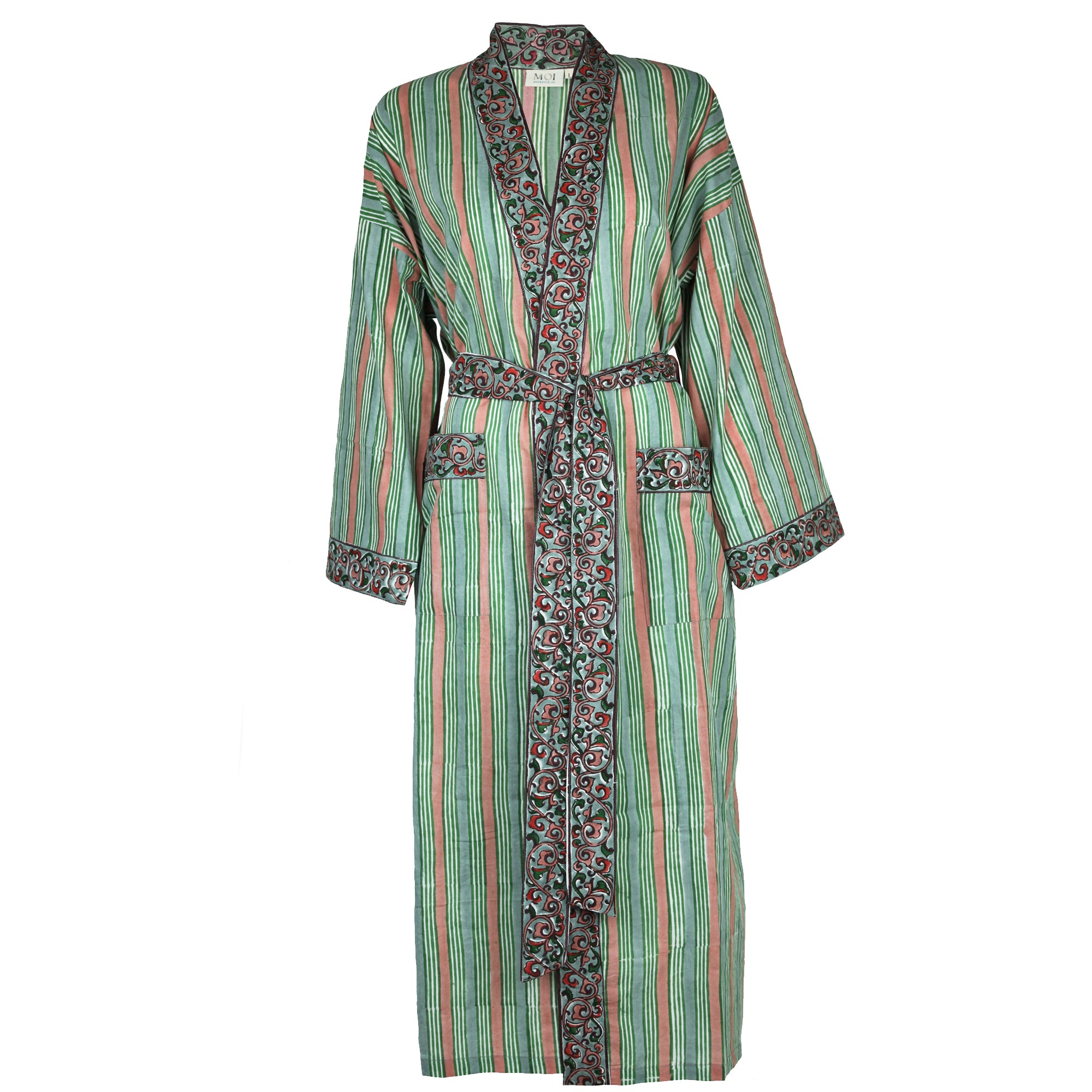 Morgonrock i handtryckt bomullstyg med ränder i grått, rosa och grönt.