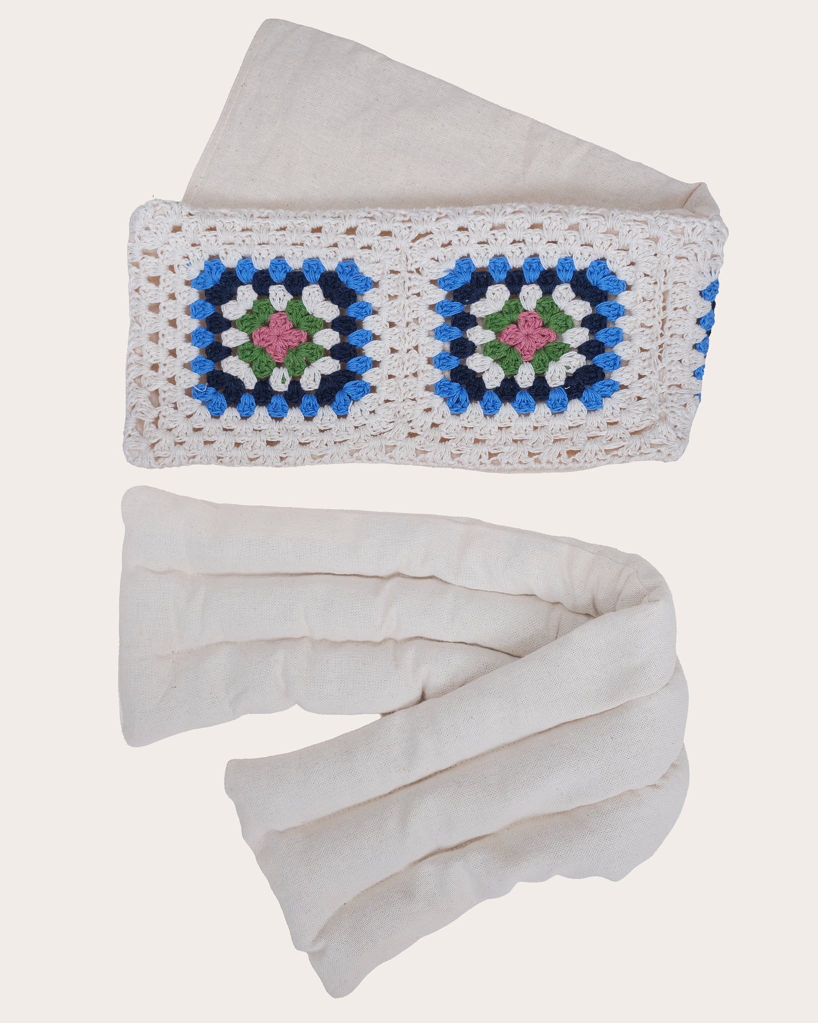 En underbar virkad nackkudde fylld med lavendeldoftande linfrön. Kan användas kyld från frysen eller uppvärmd i microvågsugn. Vetekudden tas in och ut ur det virkade utanmätet.