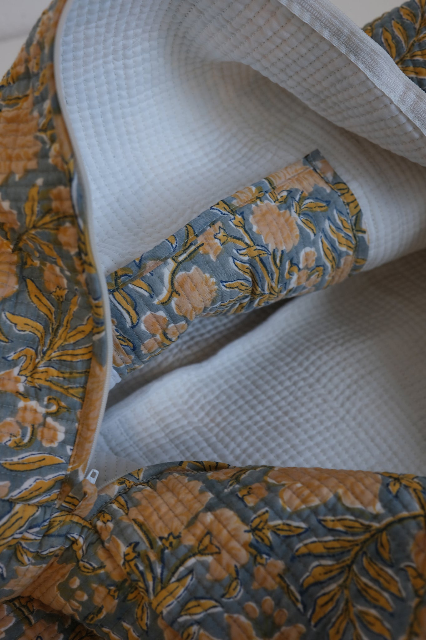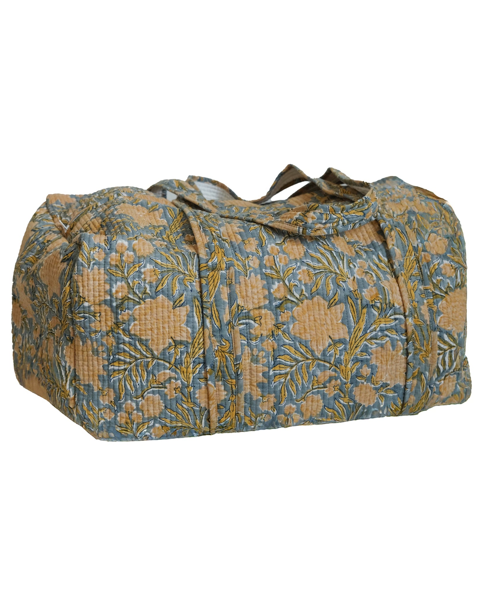 Weekendväska i handtryckt bomullstyg med blommönster. Enfärgad insida och blixtlås.