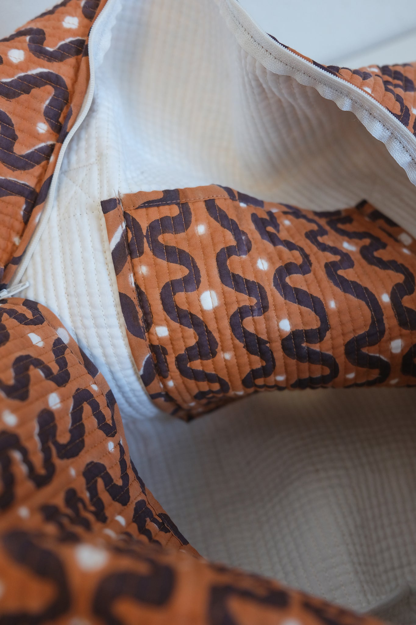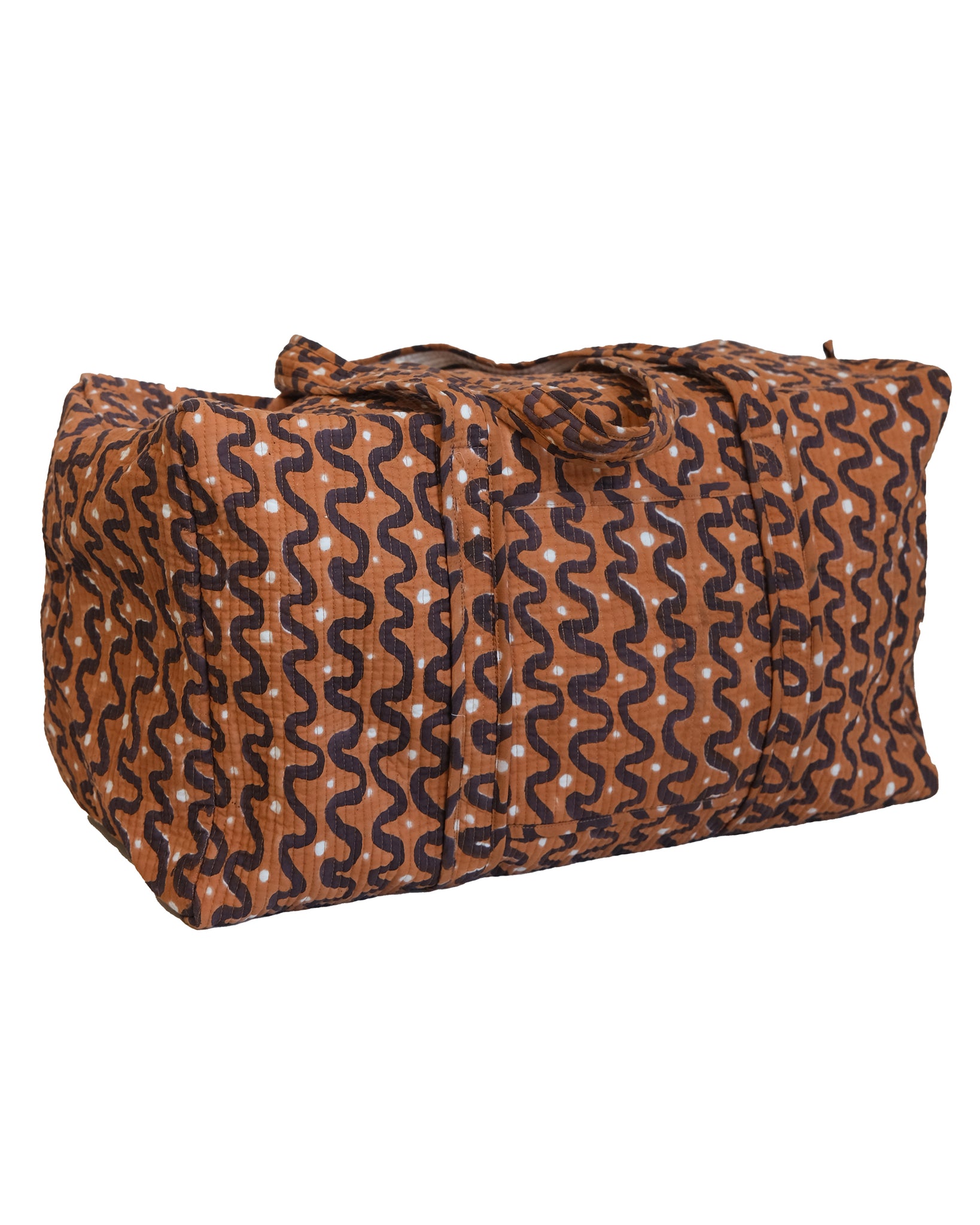 Weekendväska i handtryckt bomullstyg med blommönster. Enfärgad insida och blixtlås.